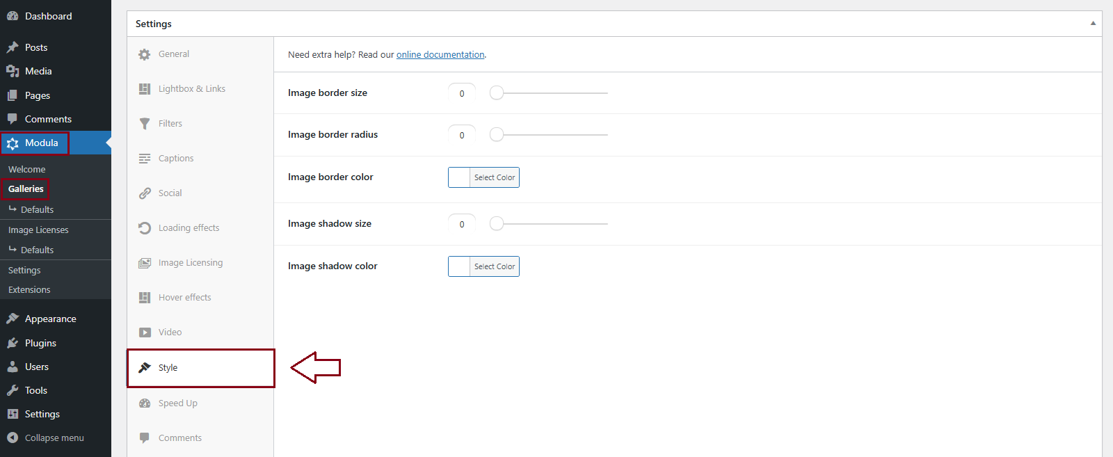 To adjust the style of your gallery, just head over to the gallery’s settings. Simply go to Modula > Galleries, choose the gallery you’d like to edit, and scroll down to find the ‘Style‘ section.