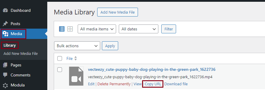 Go to your WordPress dashboard > Media Library > Upload the self-hosted video.