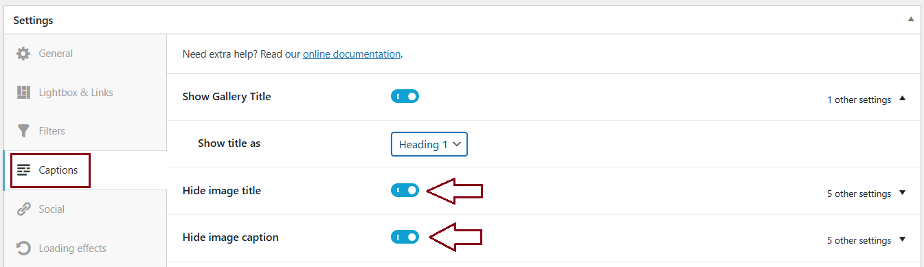 If you want to remove the image title/captions from your thumbnails, the easiest way is to go to Modula > Edit gallery > Captions > Turn ON ‘Hide image title‘ and ‘Hide image caption‘.