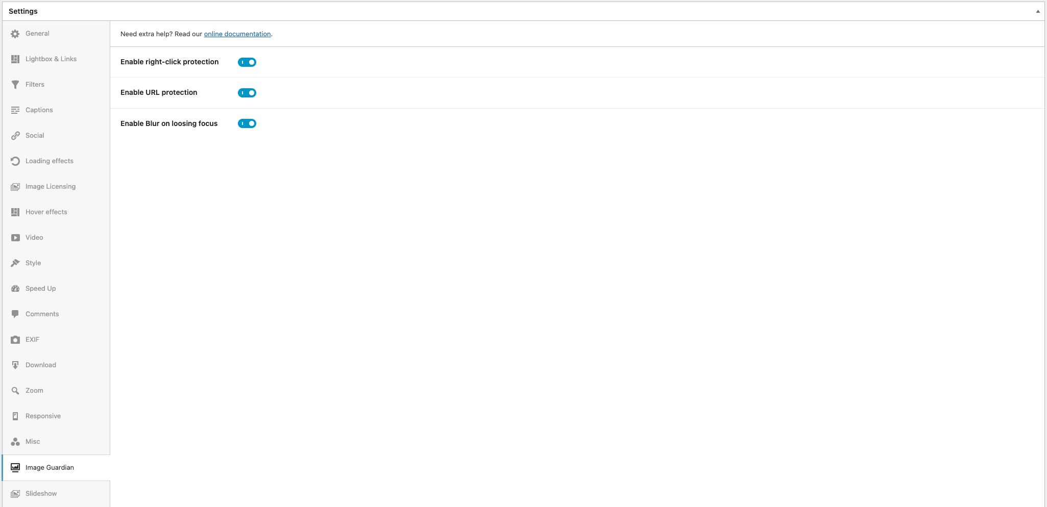 In the gallery settings, locate the “Image Guardian” tab, and toggle your desired protection options to “ON.“ - Save Changes