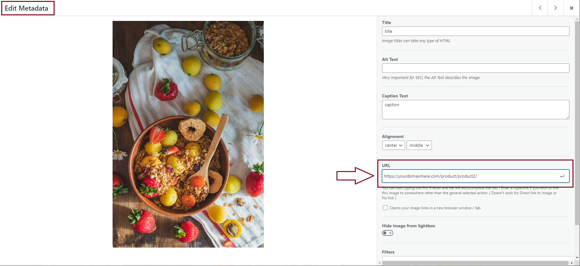 After you click to edit the image > you will see the Metadata screen where you can add the product’s URL to that image > add it in the URL field.