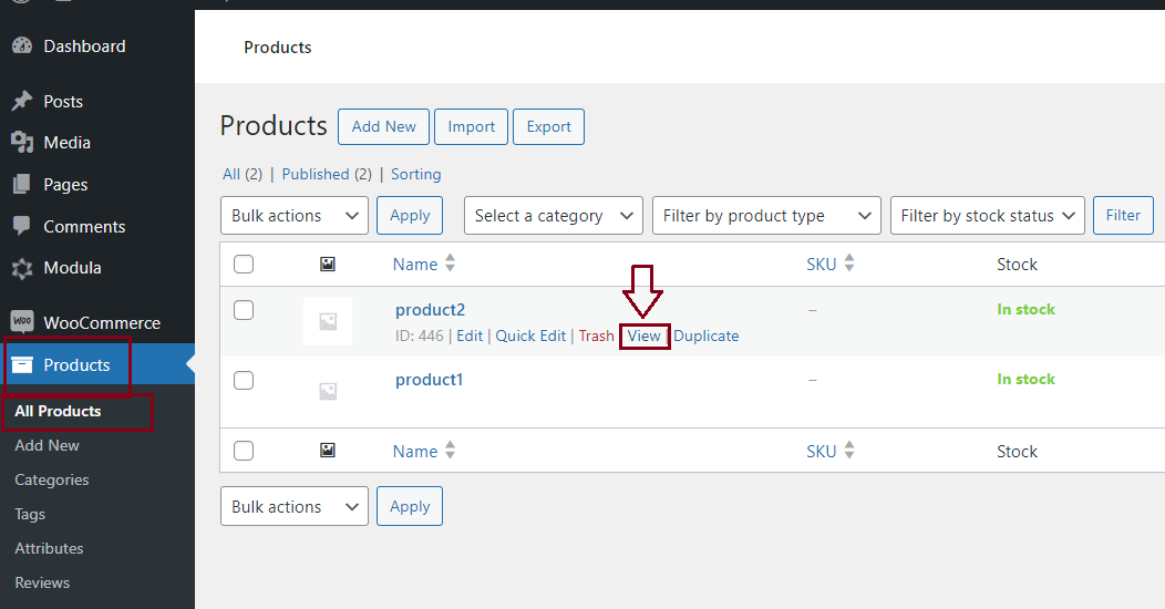Go to your WordPress dashboard > Products > and here you will see a list of your products > hover your cursor over the one you want > and click View.