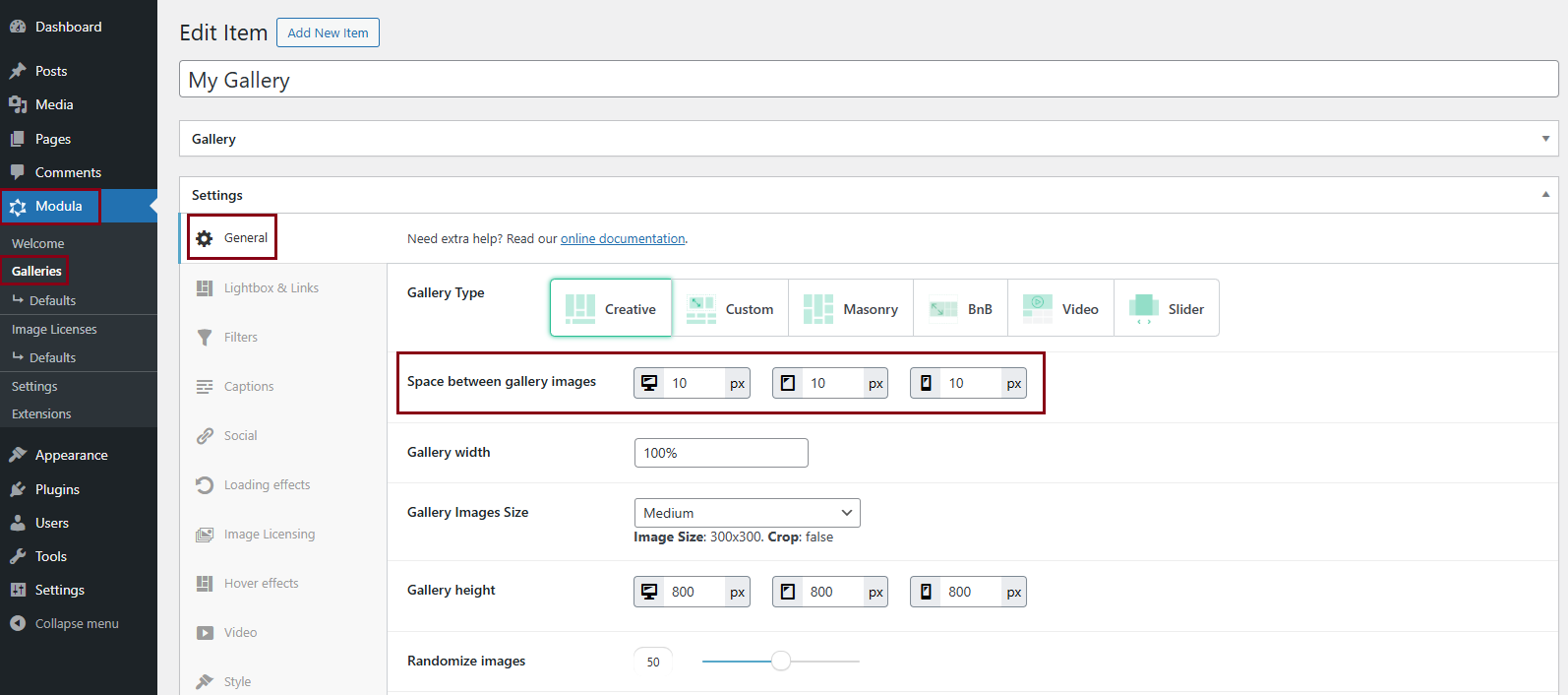 Go to your WordPress dashboard > Modula > Galleries > Edit the specific gallery where you want to adjust the Space between gallery images setting.