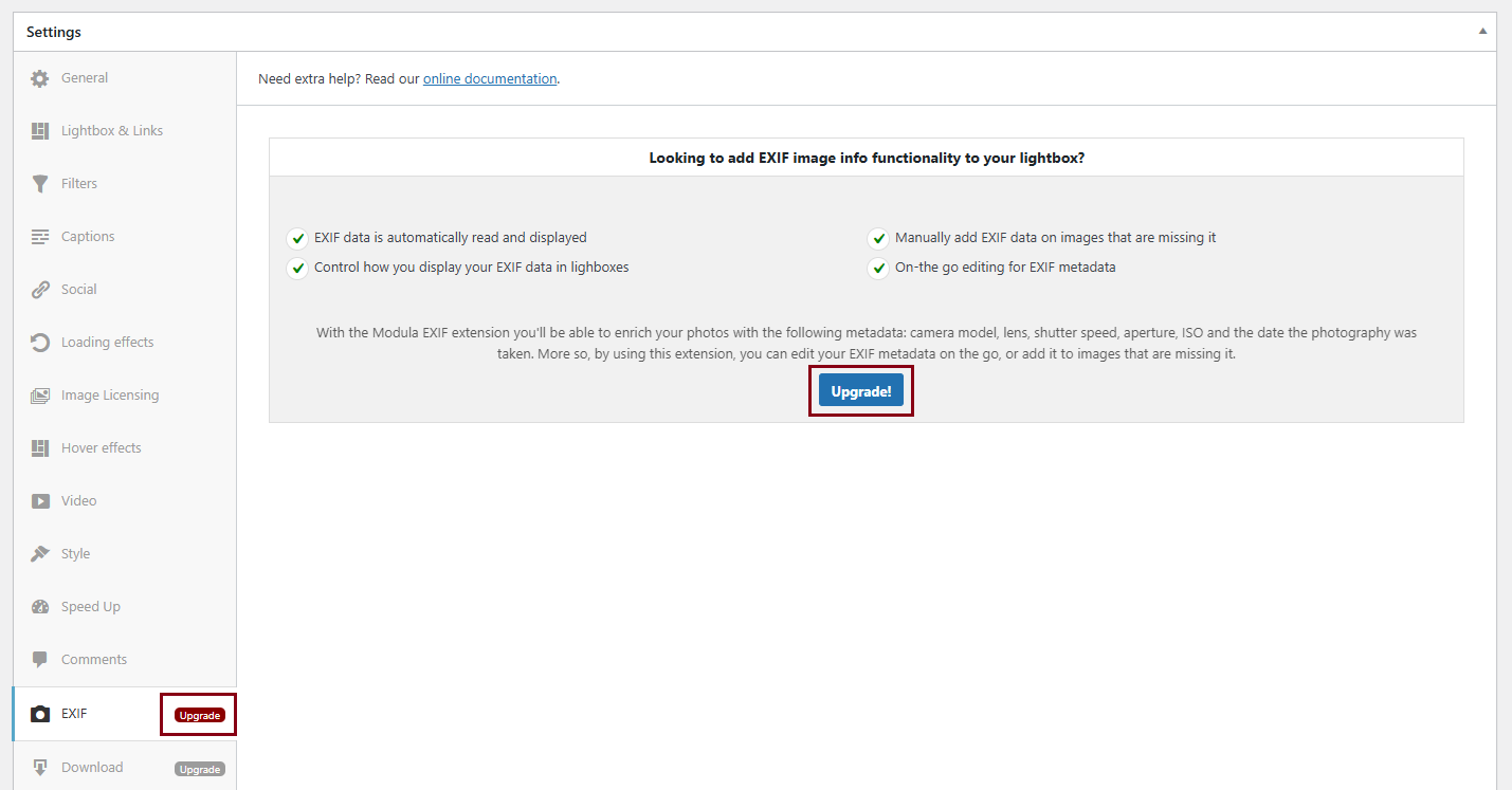 For example, let’s say that you purchased our Basic plan and you managed to install and activate the pro version of our plugin and the extensions that come with the plan. When you edit one of your galleries you may see somewhere on the right side those ‘Upgrade’ messages.