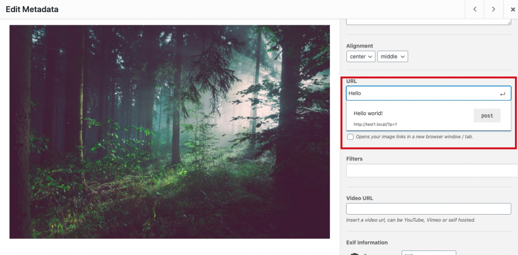Much requested, the autosuggest URL field of the image. The URL suggested will be for posts, pages or even WooCommerce products that live in your database.
