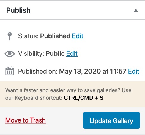For those keyboard warriors out there, we’ve added an even faster way to update/save your galleries. Just hit the magic keyboard combination (hint: it’s not magic, it’s highly visible, and for reference, it’s CTRL/CMD + S) and you’re done. Easy peasy.