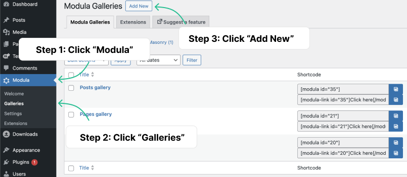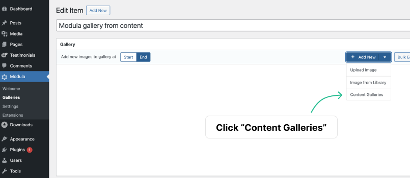 Navigate to the Gallery configuration section in your WordPress Dashboard “Modula” > “Galleries” > “Add New”.