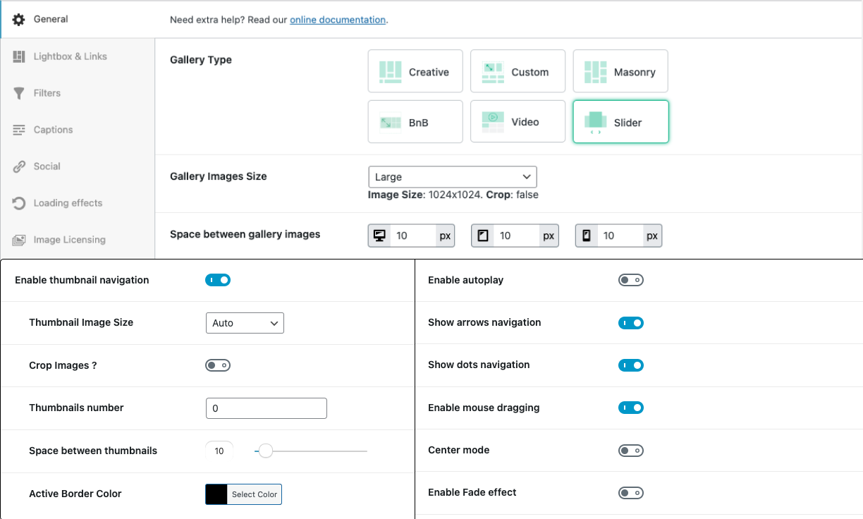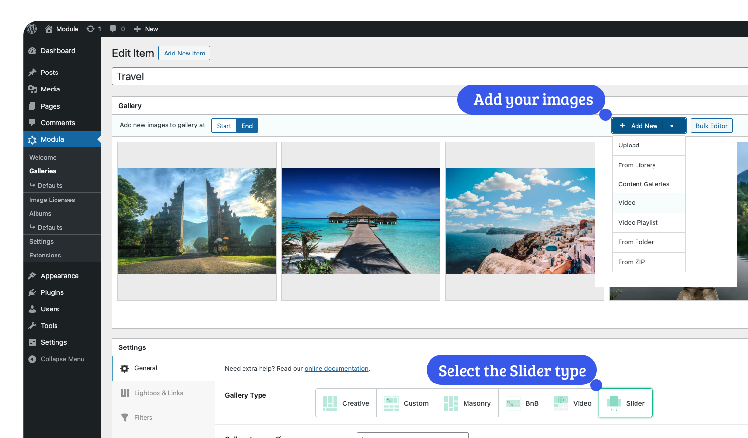 Select the Slider gallery type, then upload your desired images. Customize the slider layout and behavior.