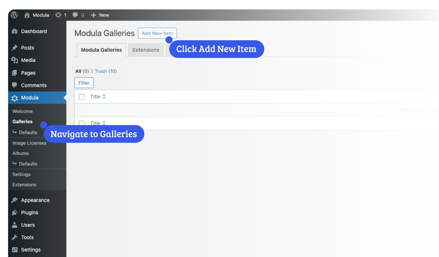 Once the add-on is installed and enabled, go to WordPress Dashboard > Modula > Galleries. Use the “Add new” button to create your gallery, then give it a name.