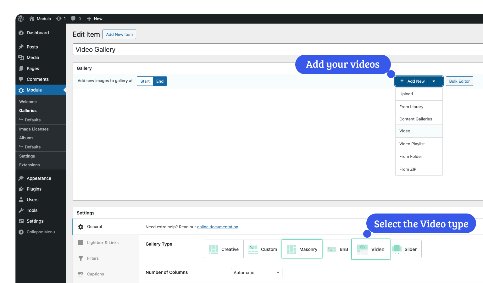 Select the Video gallery type, then either upload or link to Youtube, Vimeo videos. Configure the gallery settings.