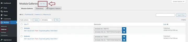Whenever you need to create an image or video gallery, go to the Modula icon and click Add New.