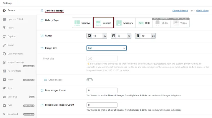You can choose between 6 gallery grids: creative, custom, masonry, slider, video, and BnB. I usually like to resize my images, so I chose the custom grid.