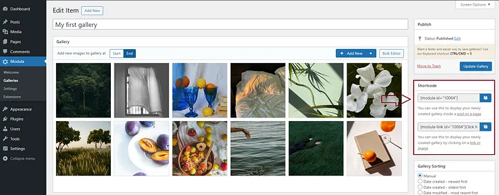 Then, you can copy the shortcode and paste it inside a page or a post. And this is how you create a photo gallery for your website using WordPress and Modula.