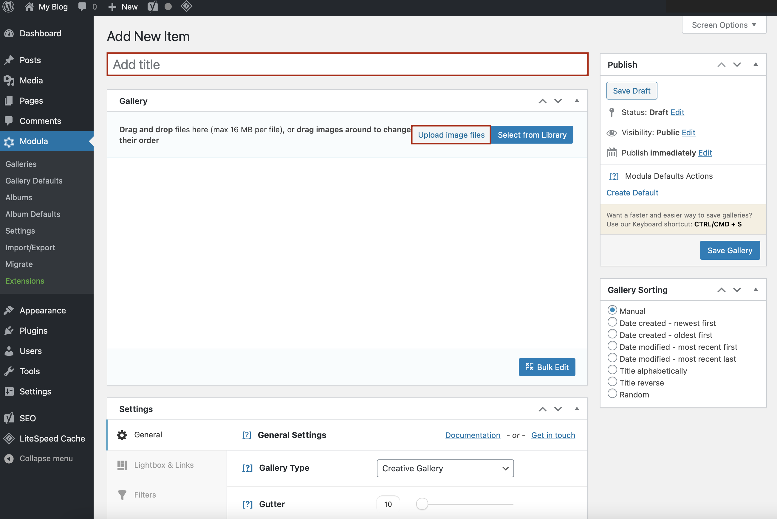 Look for the Modula icon (you can’t miss it!) and give it a click. Choose the “Add New” option. Now, give your gallery a snazzy title. Be creative; let it reflect the vibe of your amazing images.