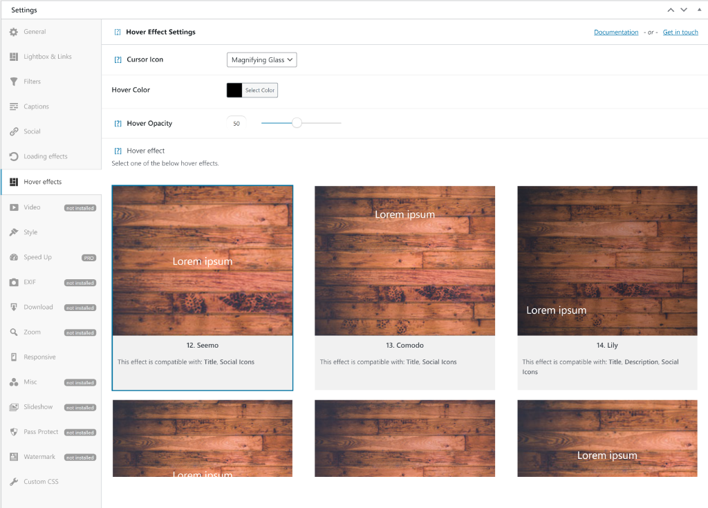Here you can choose from more than 40 different types of hover effects. You can even change the cursor icon, hover color, or hover opacity.