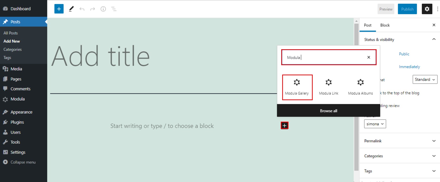 To add your gallery to a WordPress website, go to a page/post, click on the “+” icon, and search for Modula.