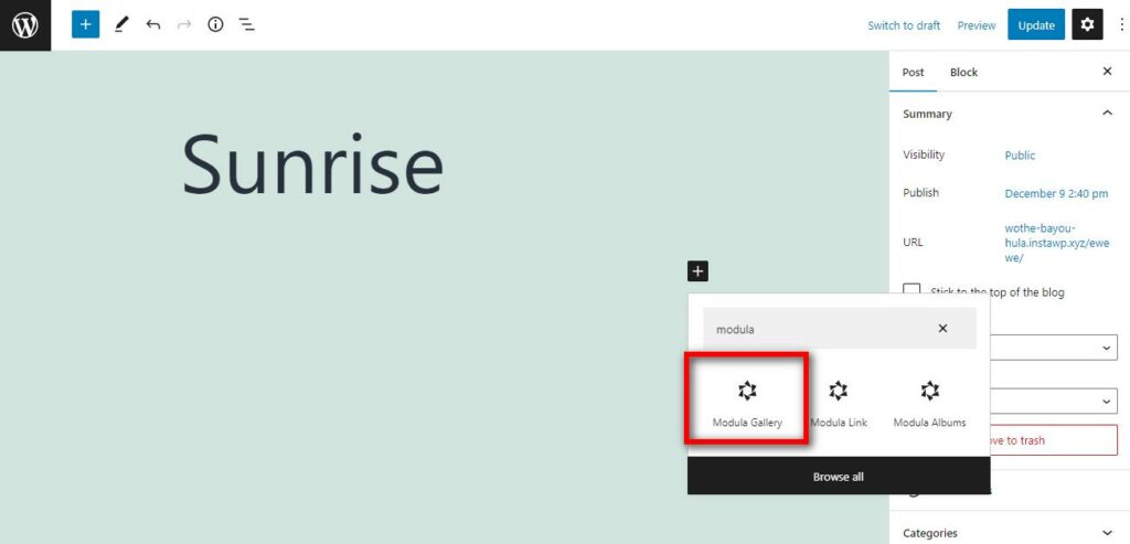 Navigate to the content you need to add the gallery to; in the block editor, click on the plus icon and type Modula: