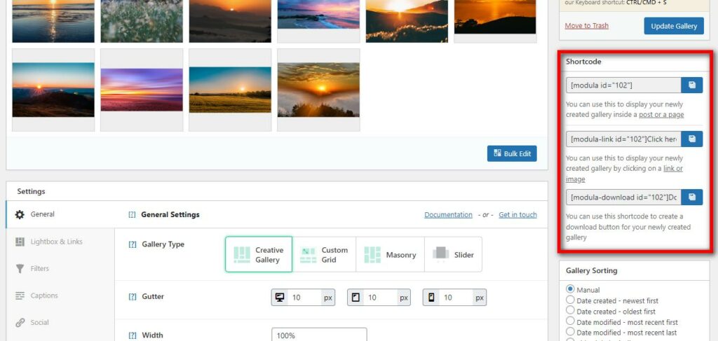 There are two methods to add your newly created gallery to a post/page or custom post type. One is via a shortcode; all you have to do is click to copy the shortcode: