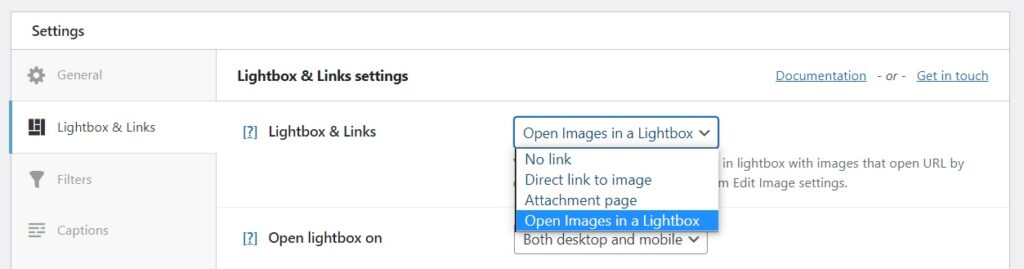 Next, go to Lightbox&Links and select Open Images in a Lightbox from the available drop-down menu. This will allow your captions to display when people click on one of your photos.