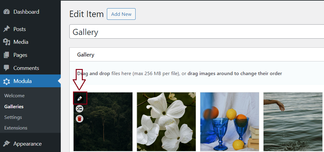 In this tutorial, I’ll show you how to embed YouTube videos into your Modula gallery. If you hover your mouse cursor over every image, there will appear three icons: pencil (to edit the image’s metadata), reverse (to replace your image file), and trash (to delete image files). Click on the pencil icon to edit your image.