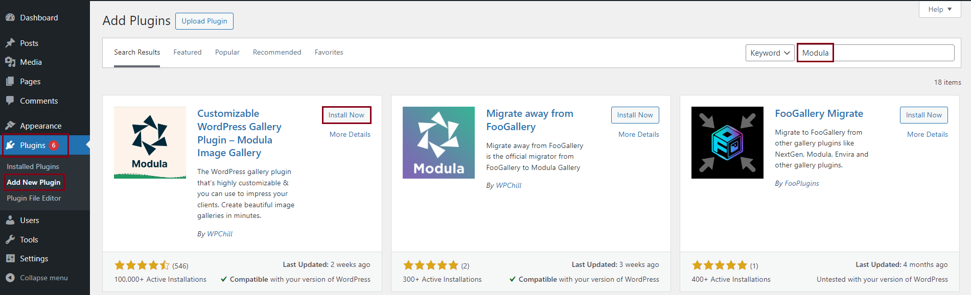 Type Modula in the search bar in the upper right corner, and then click on Install Now.
