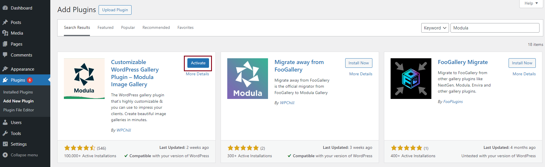 You will see a search bar in the upper right corner, so type Modula. When you find the plugin, click on Install Now.